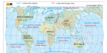 Mapamundi con los límites entre océanos y Europa y Asia.