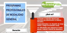 Todo lo que necesitas saber para estudiar PROGRAMAS PROFESIONALES de MODALIDAD GENERAL ORIENTAPILLS: en qué consisten estos estudios, cuánto duran, requisitos, titulación, dónde estudiar, especialidades... Con enlaces interactivos a los sitios más importantes en relación con el perfil de estudios.