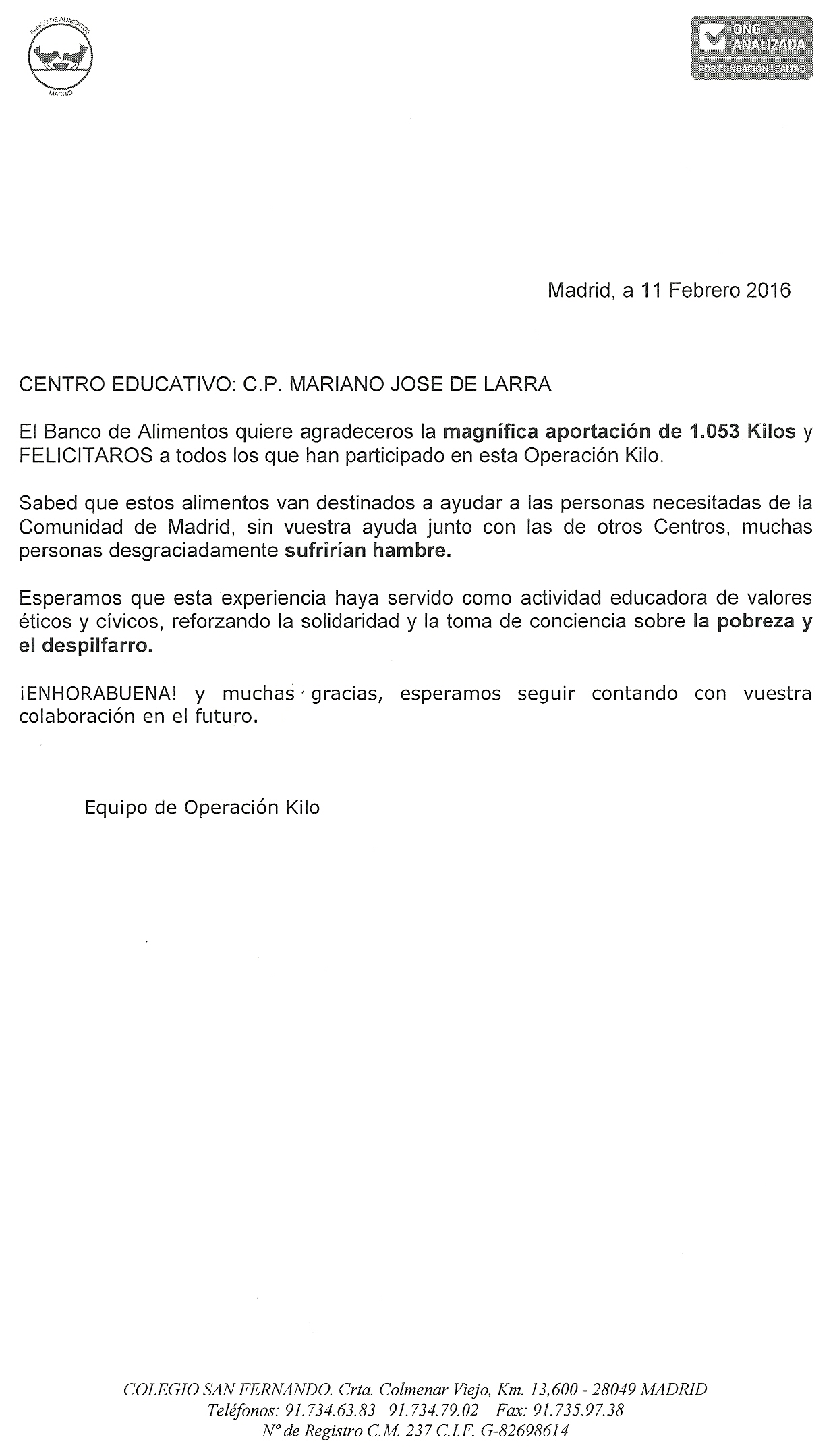 CERTIFICADO DE RECOGIDA DE ALIMENTOS