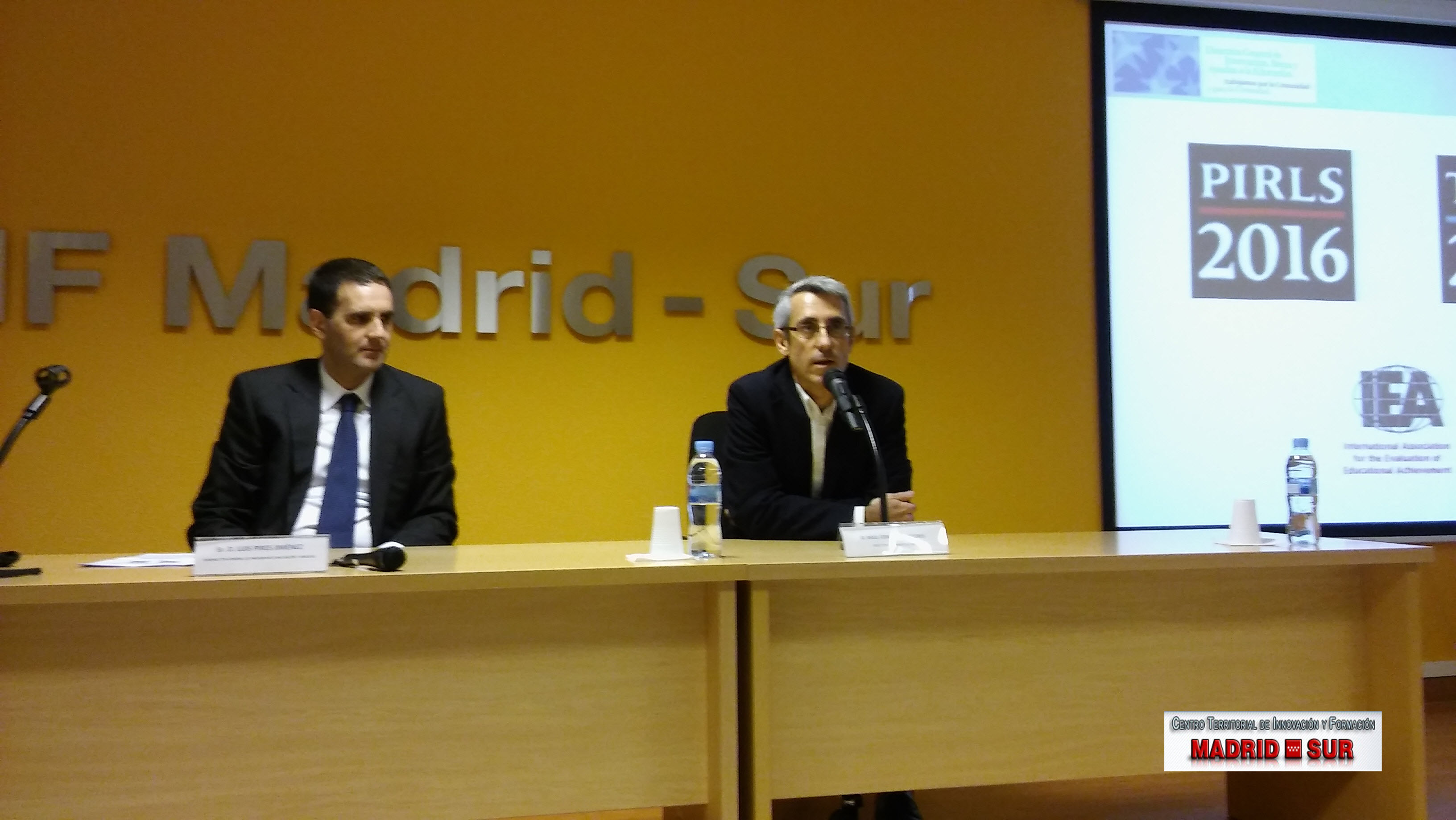 - El director del CTIF Madrid-Sur, D. Raúl Fernández Vítores, presentando al Subdirector General de Evaluación y Análisis, D. Luis Pires Jiménez, en la reunión informativa sobre el Estudio Internacional de evaluación de la Comprensión Lectora en 4º curso de Educación Primaria, PIRLS (Progress in International Reading Literacy Study), de la IEA (Asociación Internacional para la Evaluación del Rendimiento Educativo), en el Salón de Actos del CTIF Madrid-Sur, el 24 de febrero de 2016.