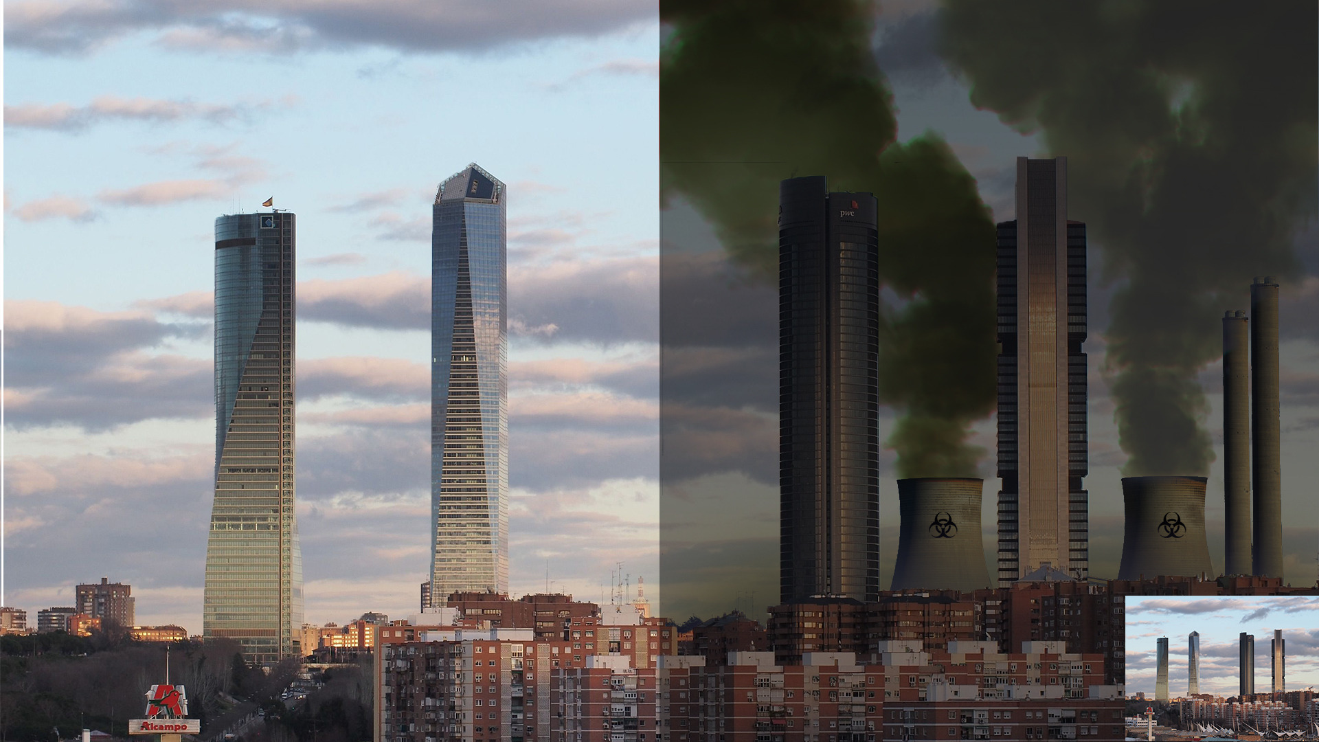 Perspectiva de una parte moderna de Madrid, dándole un enfoque degradado y dañado por la contaminación atmosférica de las fábricas. De esta manera, nuestras futuras generaciones no podrán disfrutar como nosotros de nuestros paisajes naturales.