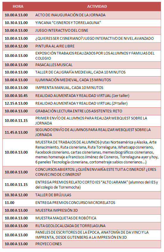 Horario de actividades para la Jornada Intercentros en Torrelaguna, Madrid, para celebrar el V centenario de Cisneros 2017