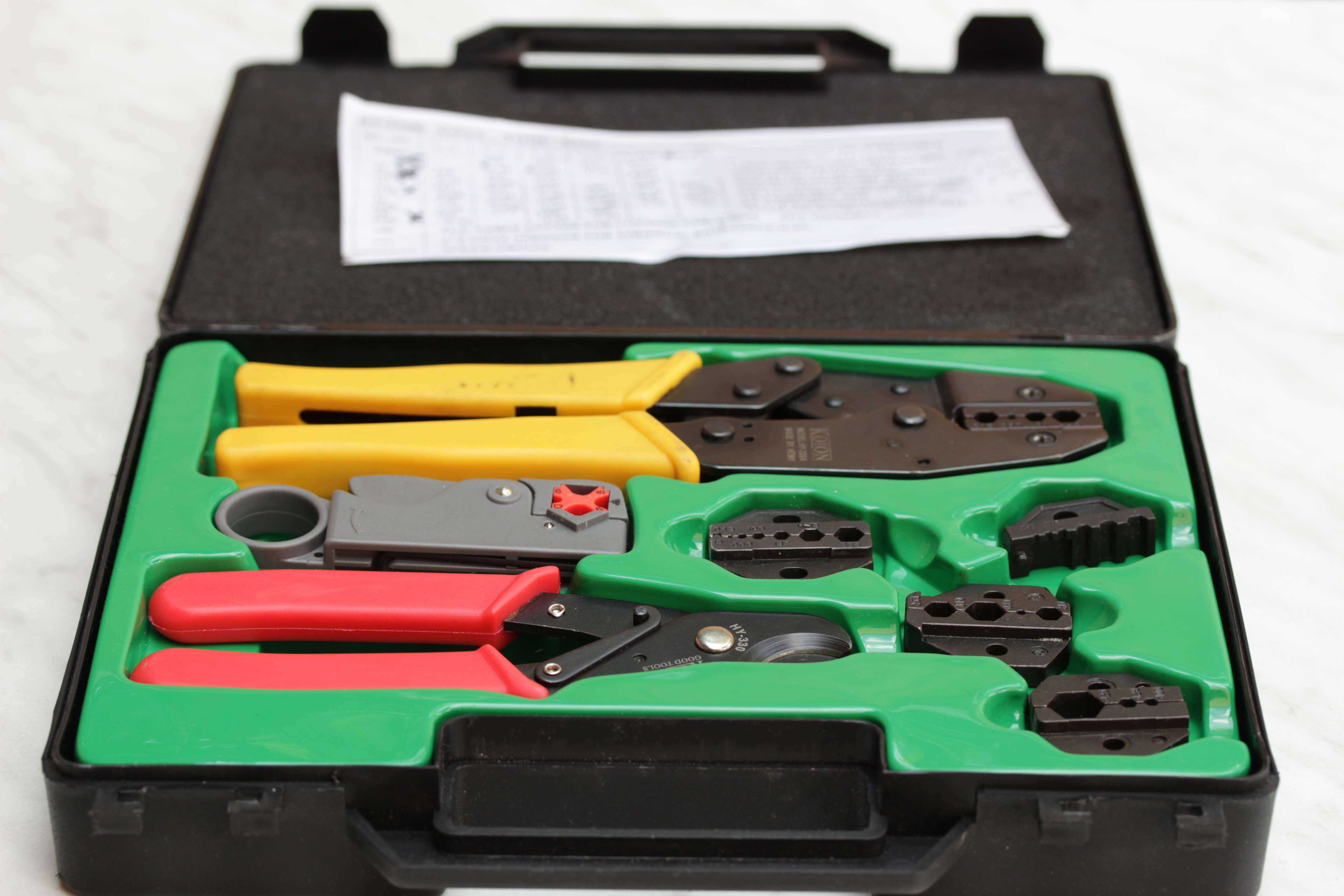 Herramienta para crimpar conectores coaxiales para radiofrecuencia y fibra óptica.