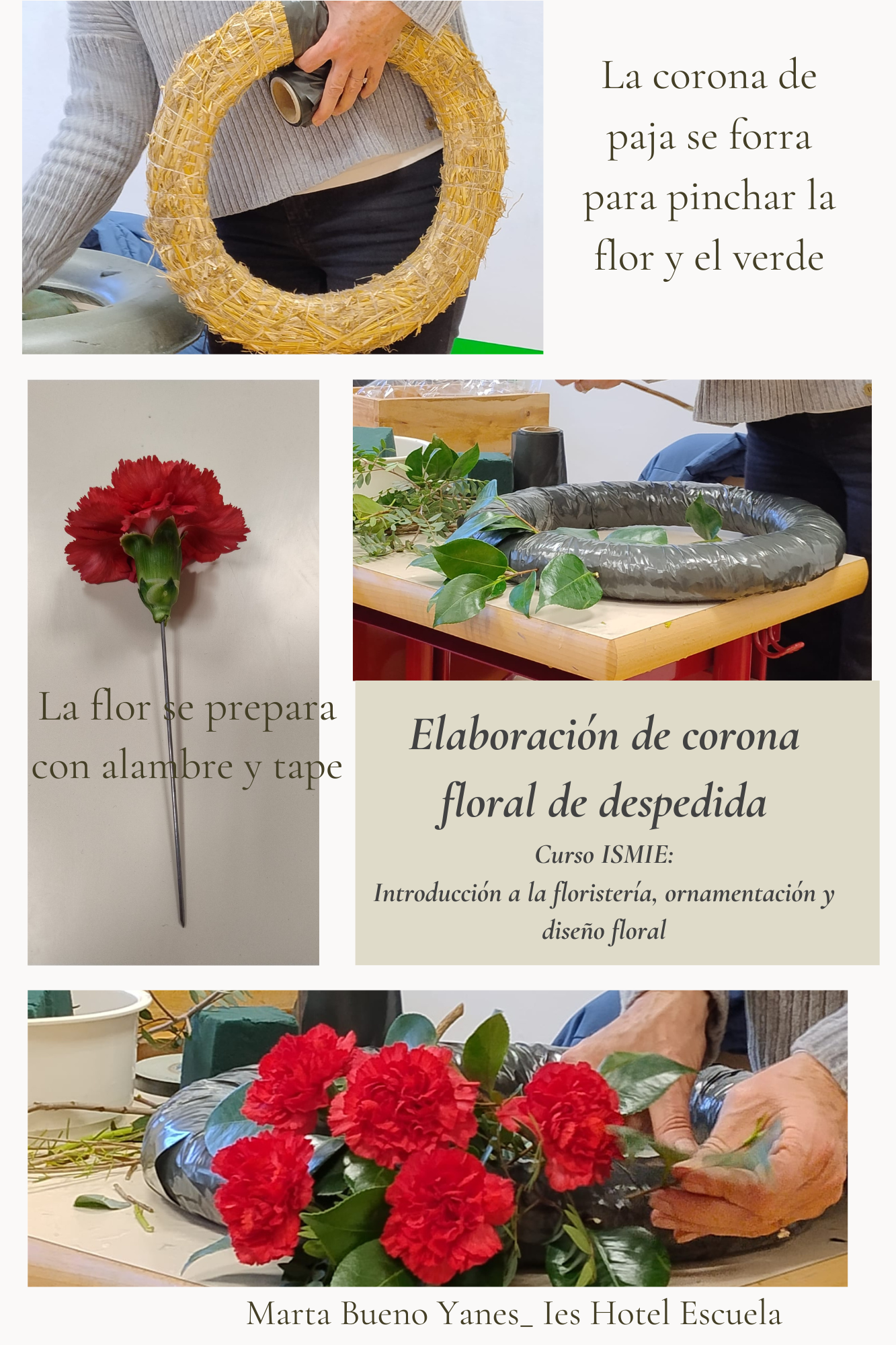 Elaboración de corona floral de despedida con corona de paja forrada y flor pinchada.