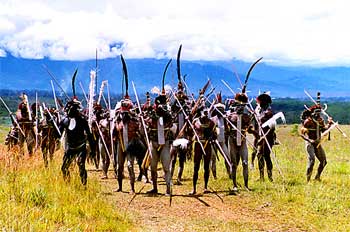 Hombres simulando una aproximación de ataque, Irian Jaya, Indone - Contenido educativo