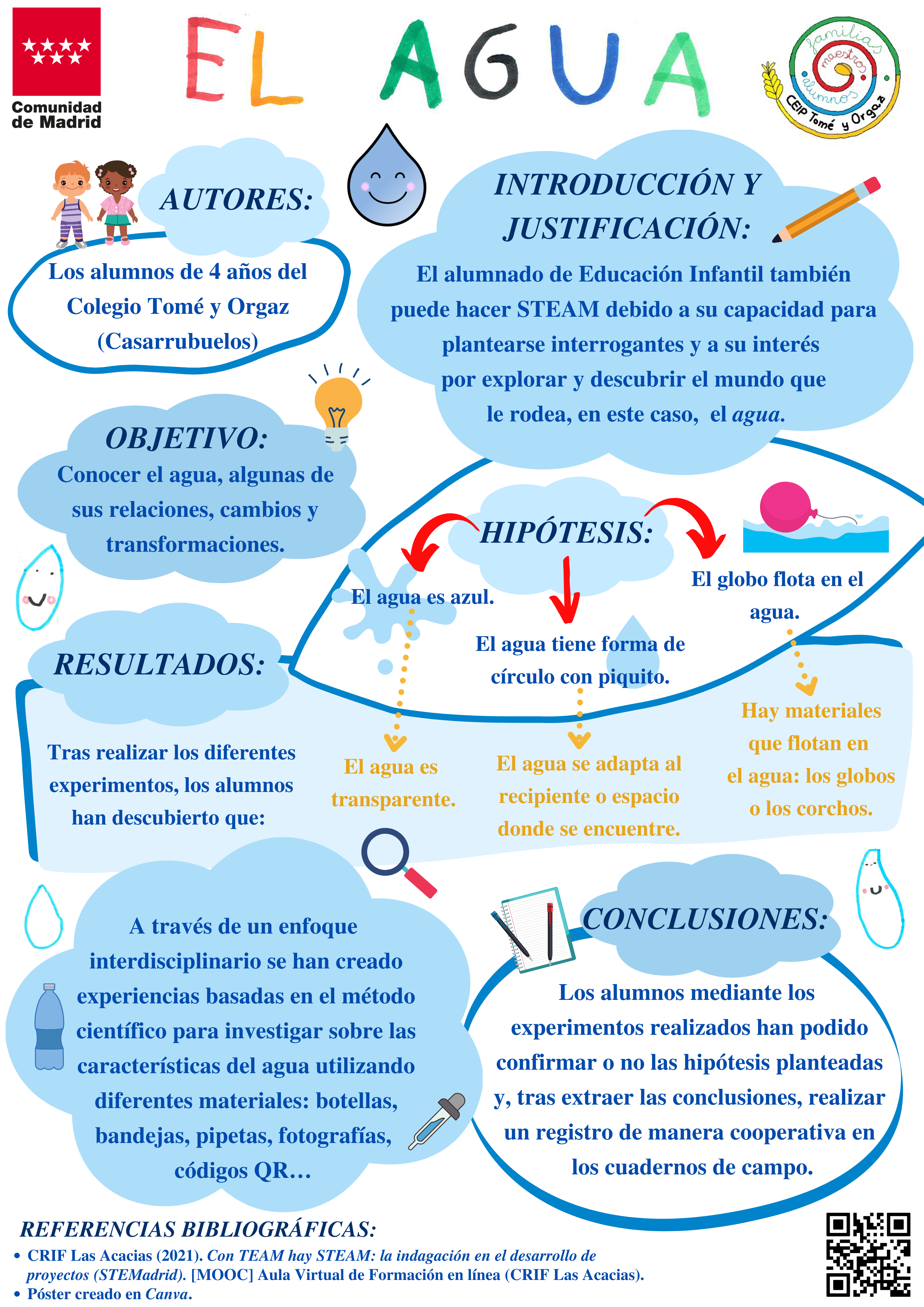 Póster para el Congreso STEMadrid 2022 en el que se presenta el trabajo realizado sobre "el agua" de los alumnos de 4 años de Educación Infantil del Colegio Tomé y Orgaz de Casarrubuelos a través de la metodología STEAM.