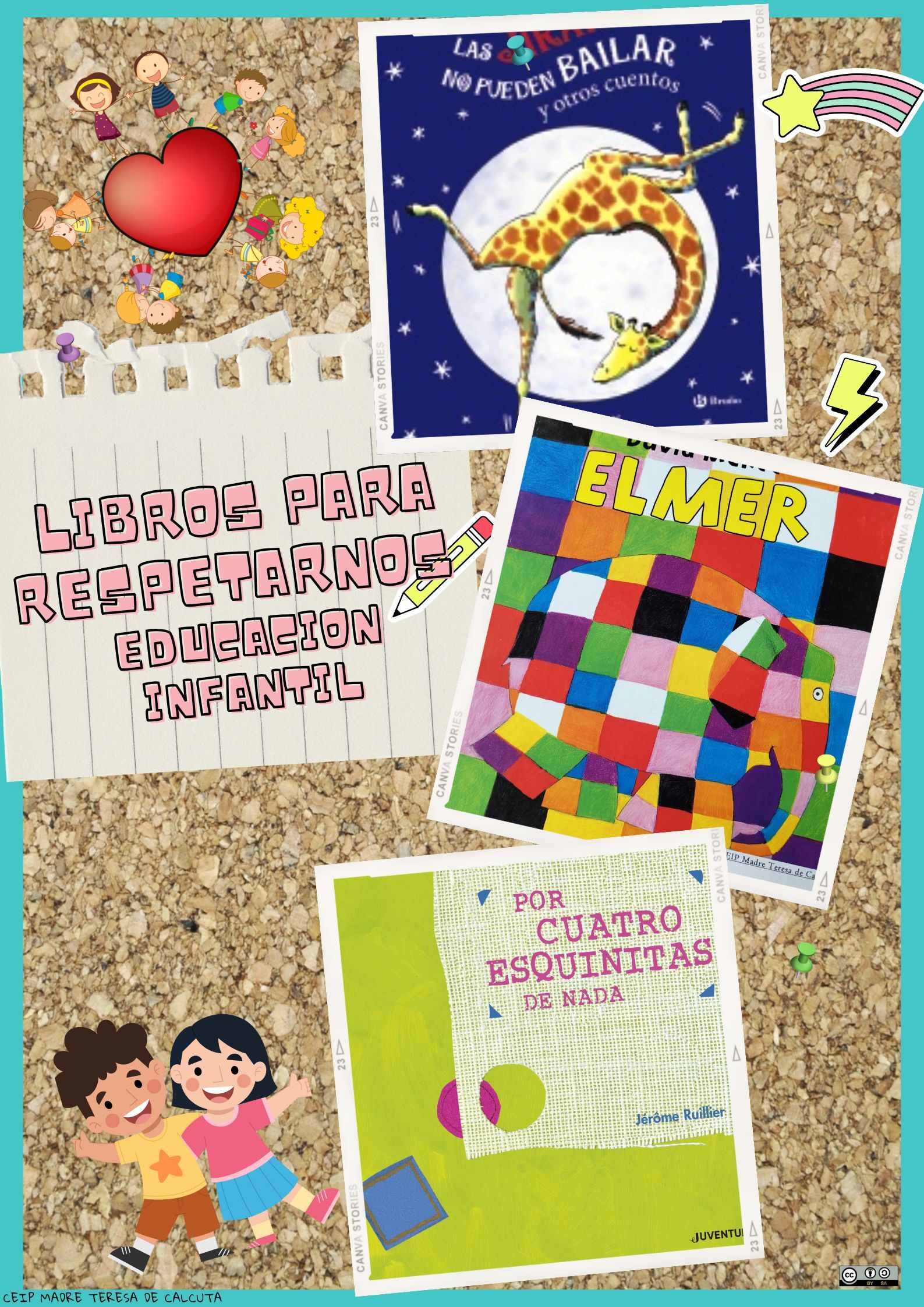 Para ello se van a realizar en clase lecturas comprensivas con preguntas reflexivas sobre el contenido de éstas, con los siguientes cuentos en 3 años “Las jirafas no pueden bailar”, en 4 años “Elmer”, en 5 años “Por cuatro esquinitas de nada”.