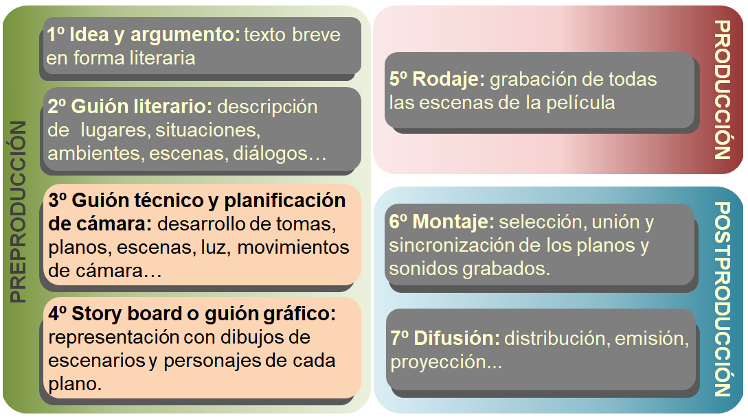 Etapas de trabajo en la creación audiovisual: preproducción, producción y postproducción.