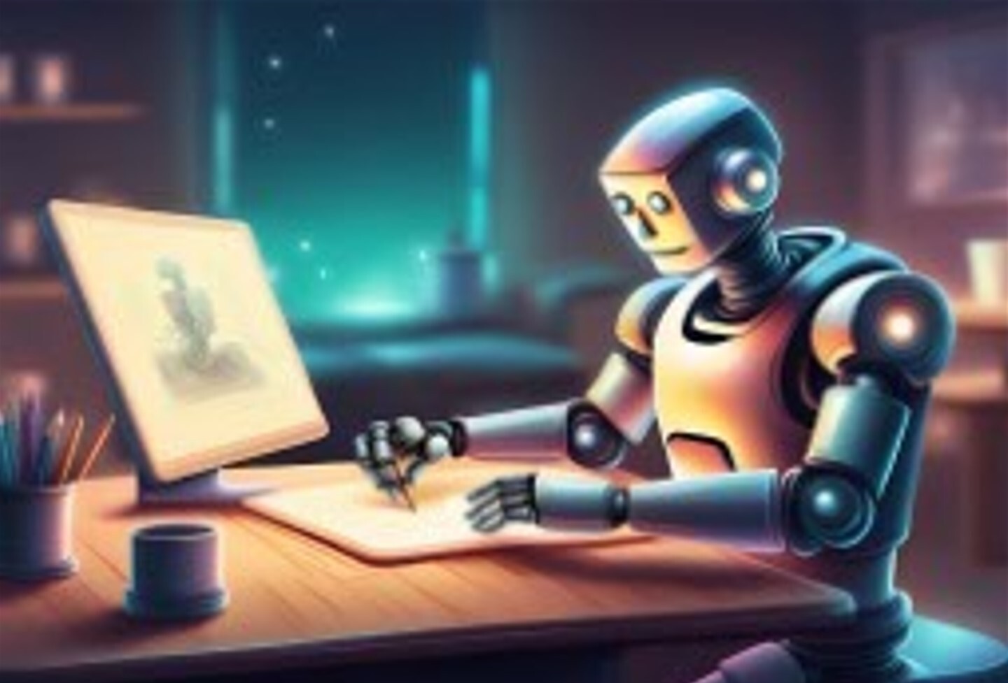 Representación de robot dibujando y realizado con IA