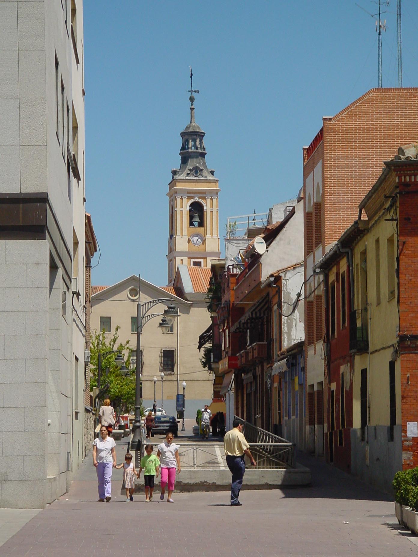 Calle con campanario de iglesia al fondo en Getafe