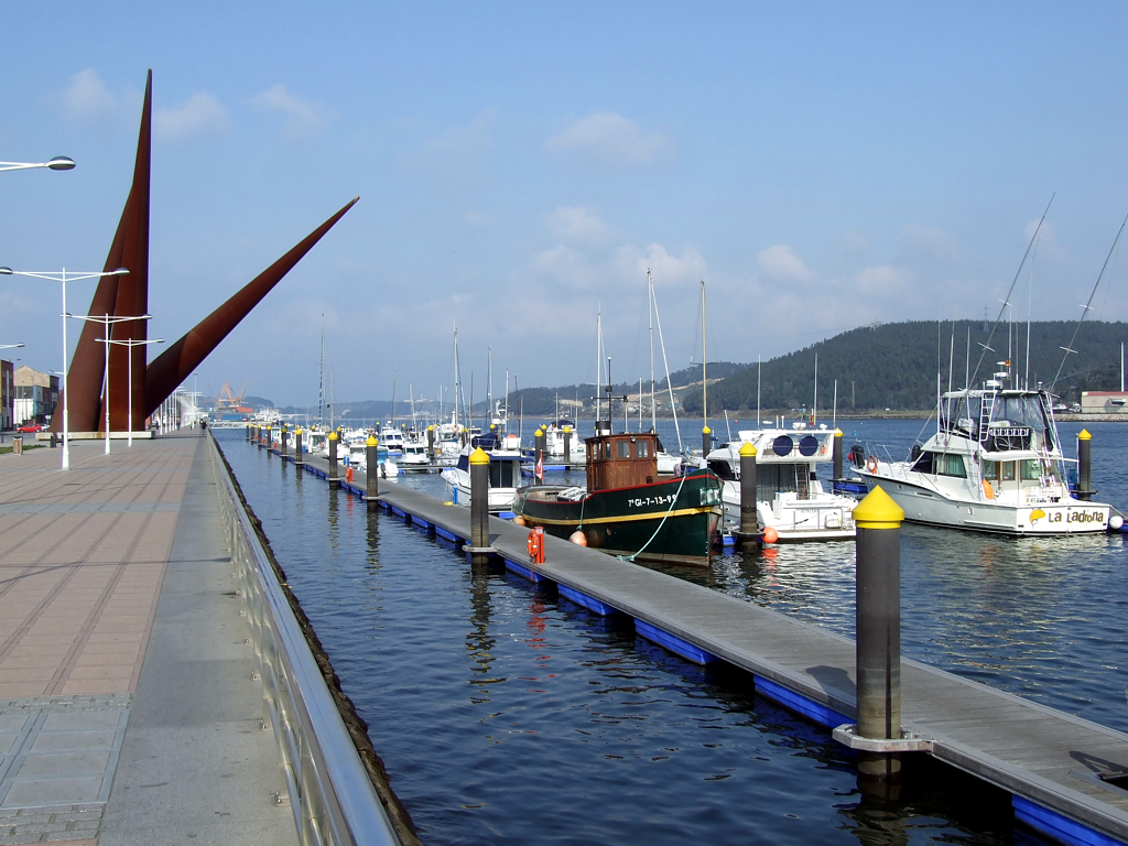 Vista parcial del puerto y la ría de Avilés. En la foto se puede ver el Club Marítimo San Balandrán, situado frente a la dársena de San Agustín, así como la escultura 'Avilés' ubicada en el paseo marítimo de la ría, en la avenida del Conde de Guadalhorce.