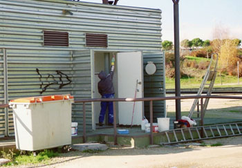 Trabajador pintando una caseta