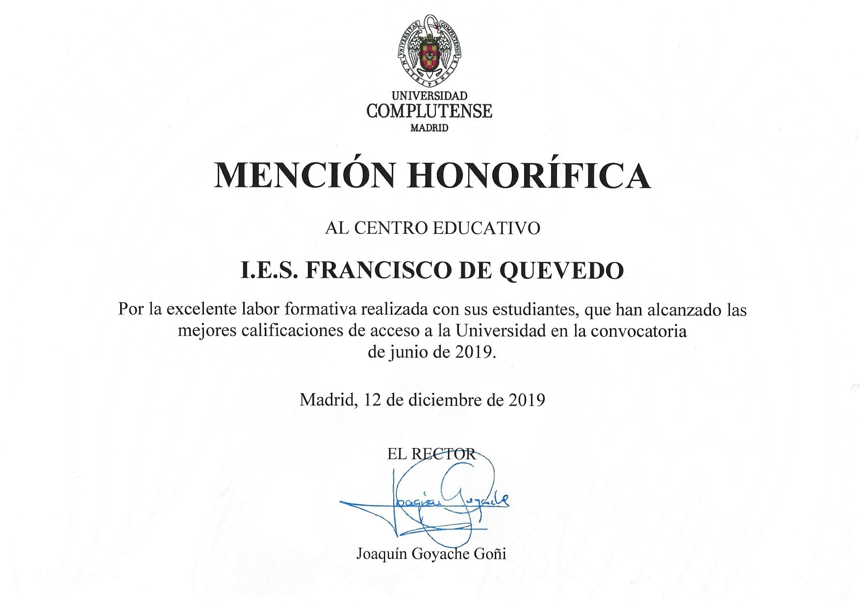 Reconocimiento Académico UCM a nuestro alumno Alex Nita y al Caustro de profesores del IES Francisco de Quevedo 2