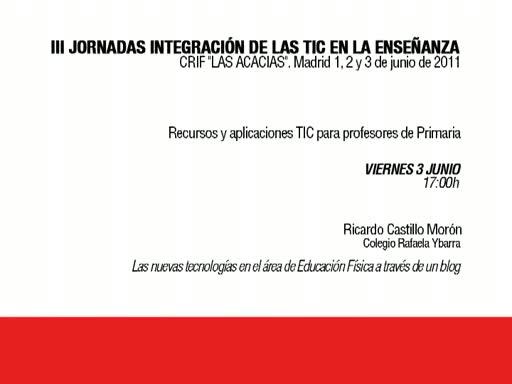 Ponencia de D. Ricardo Castillo Morón: "Las nuevas tecnologías en el área de Educación Física a través de un blog" realizada en las III Jornadas de Integración de las TIC en las Enseñanza, el 3 de junio de 2011.