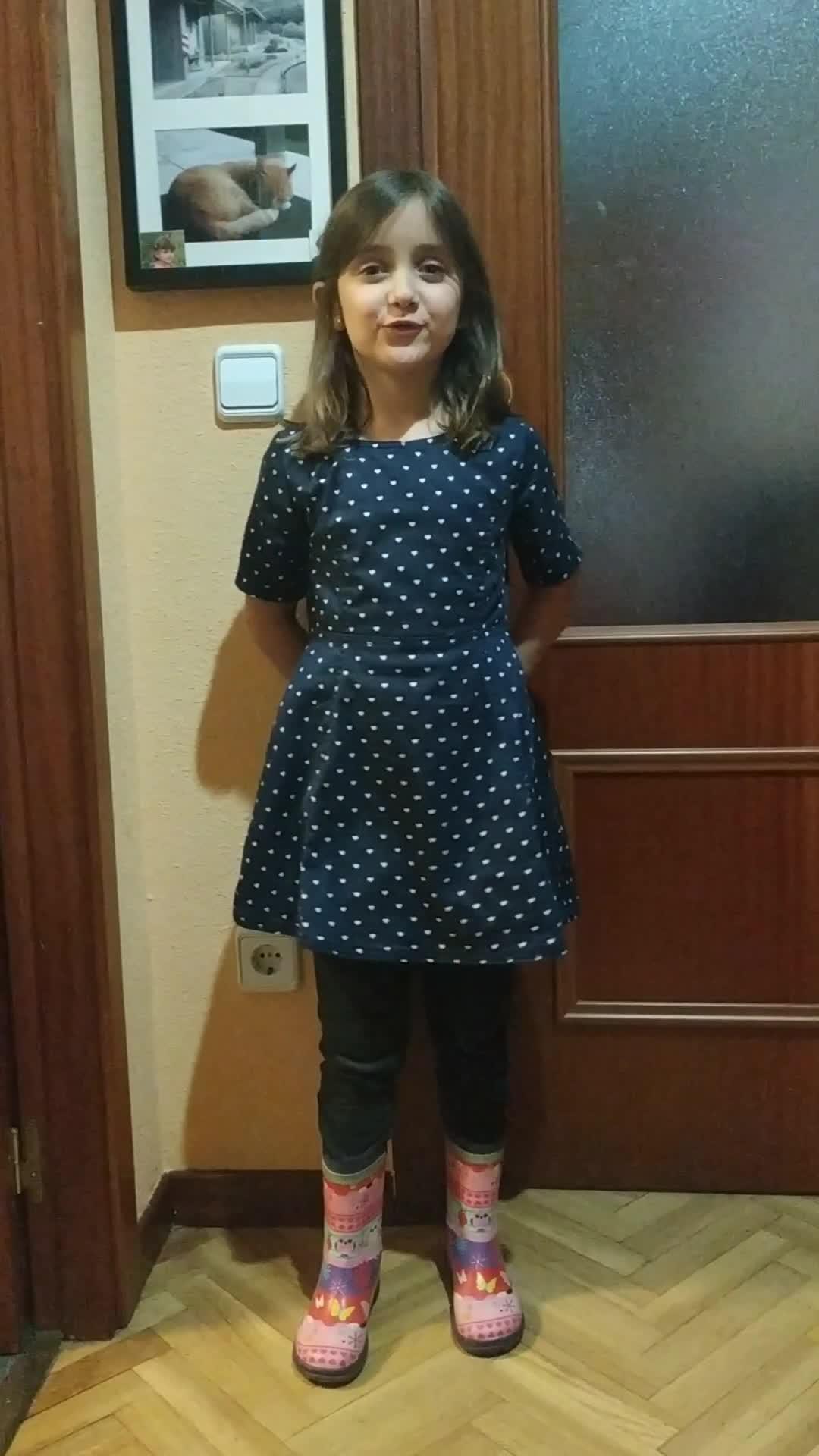 I'm wearing leggings, blue dress, pink.