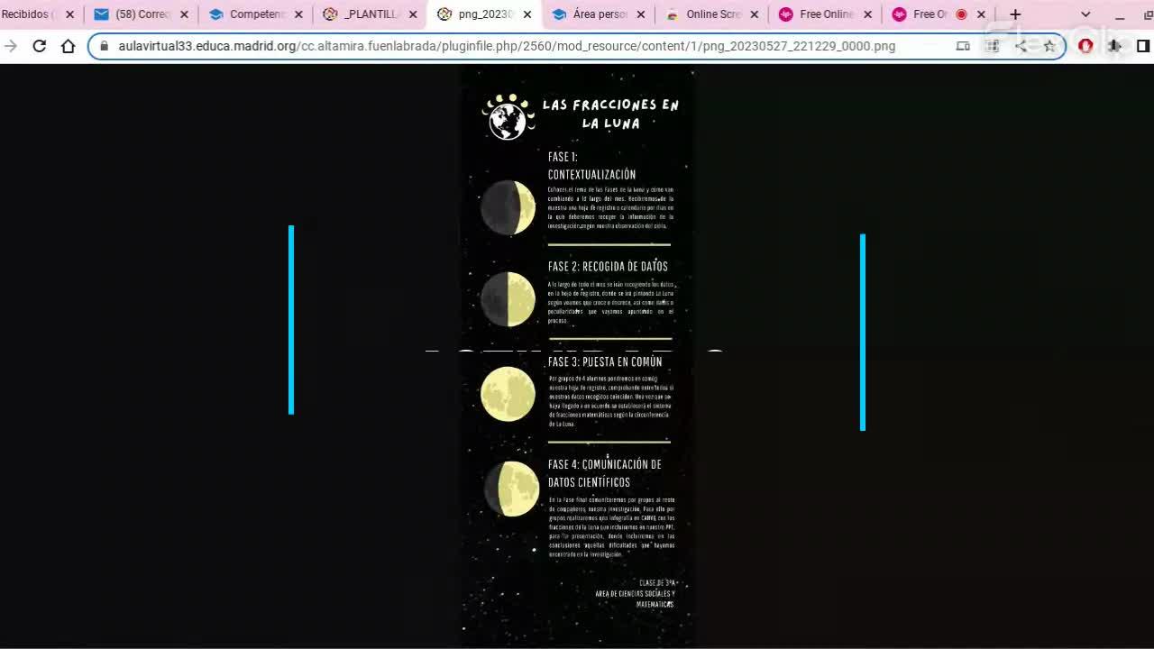 concretamente una infografía de la situación de aprendizaje elegida sobre las fases de la luna y su desarrollo matemático en fracciones.