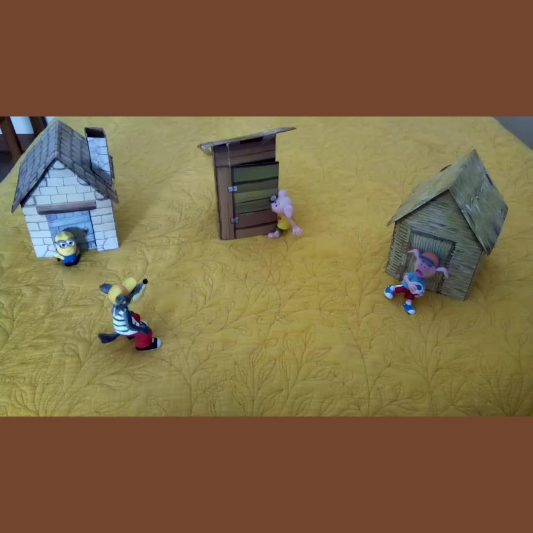 Muy bien, este Minion no tiene que estar en el cuento de los tres cerditos y el lobo, tiene que estar en el cerdito mayor. Muy bien chicos.