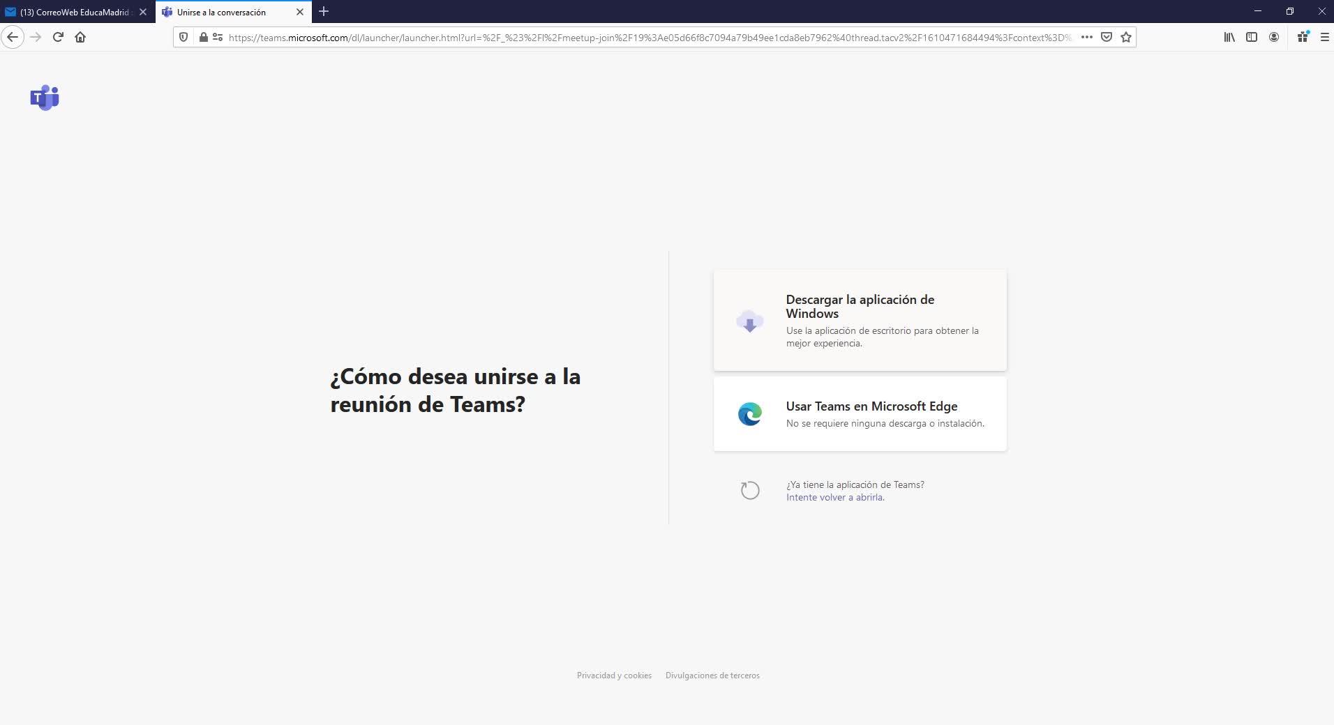 al de JoinMicrosoft, pulsáis sobre él, y es para acceder a la videoconferencia. Me aparecen aquí varias opciones, descargar la aplicación de Windows,