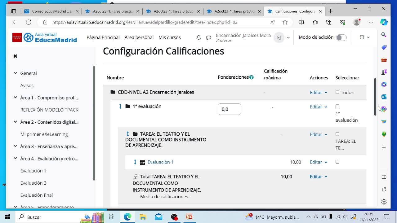 y ahí vemos cómo tenemos tres evaluaciones, primera, segunda y tercera evaluación y dentro