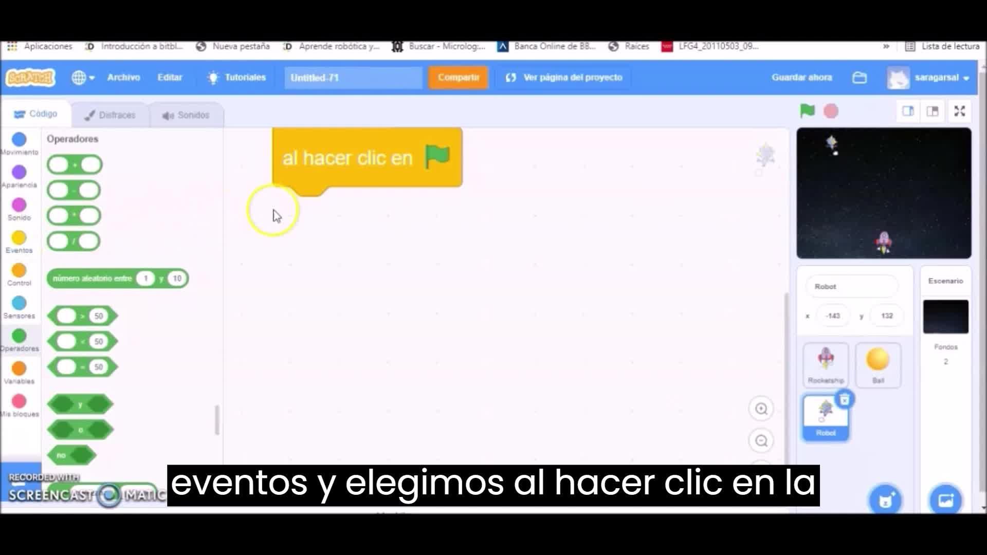 Vamos a empezar su programación. Vamos al comando eventos y elegimos al hacer clic en la bandera verde. El segundo comando que vamos a colocar es un comando que le va a indicar la posición en la que tiene que aparecer en la pantalla.