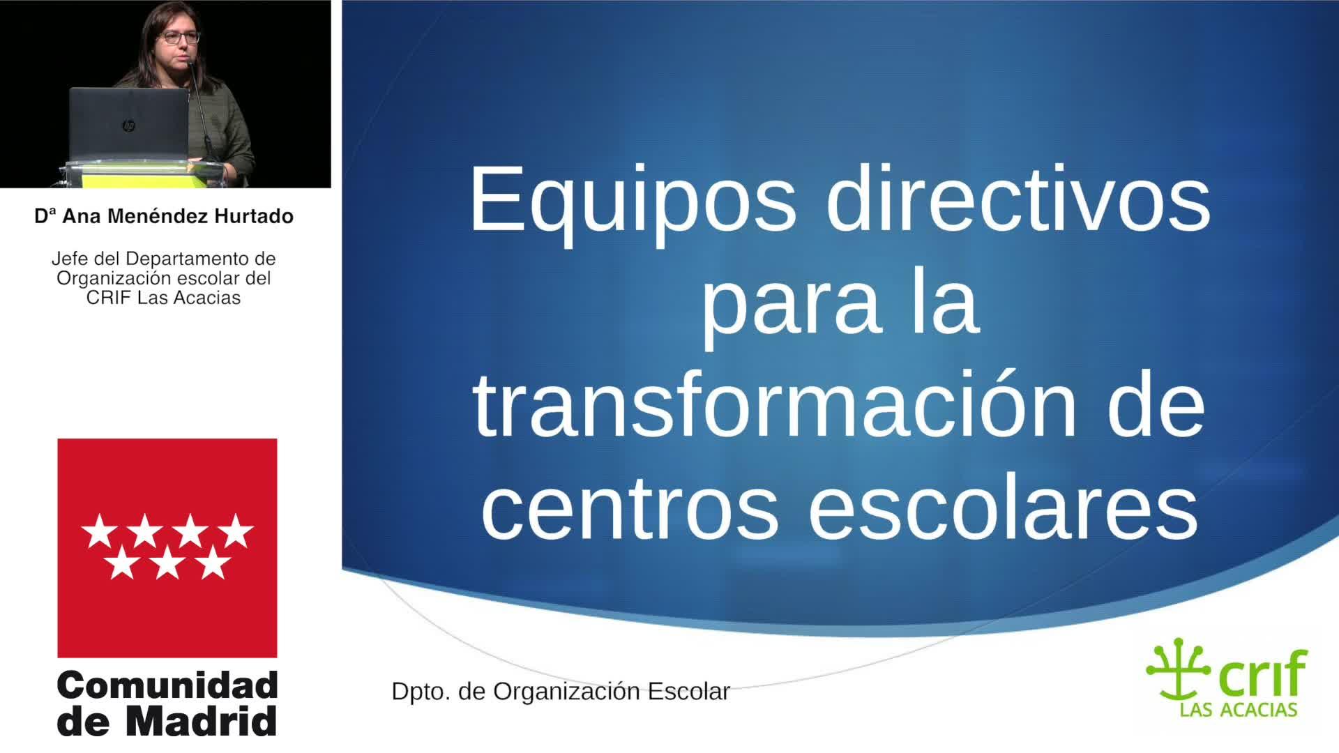 Bueno, buenas tardes. Como decía antes Vicente, soy Ana Isabel Menéndez, soy la jefa del Departamento de Organización Escolar en el CLIB Las Acacias y lo que os voy a hablar hoy es sobre equipos directivos para la transformación de centros escolares.