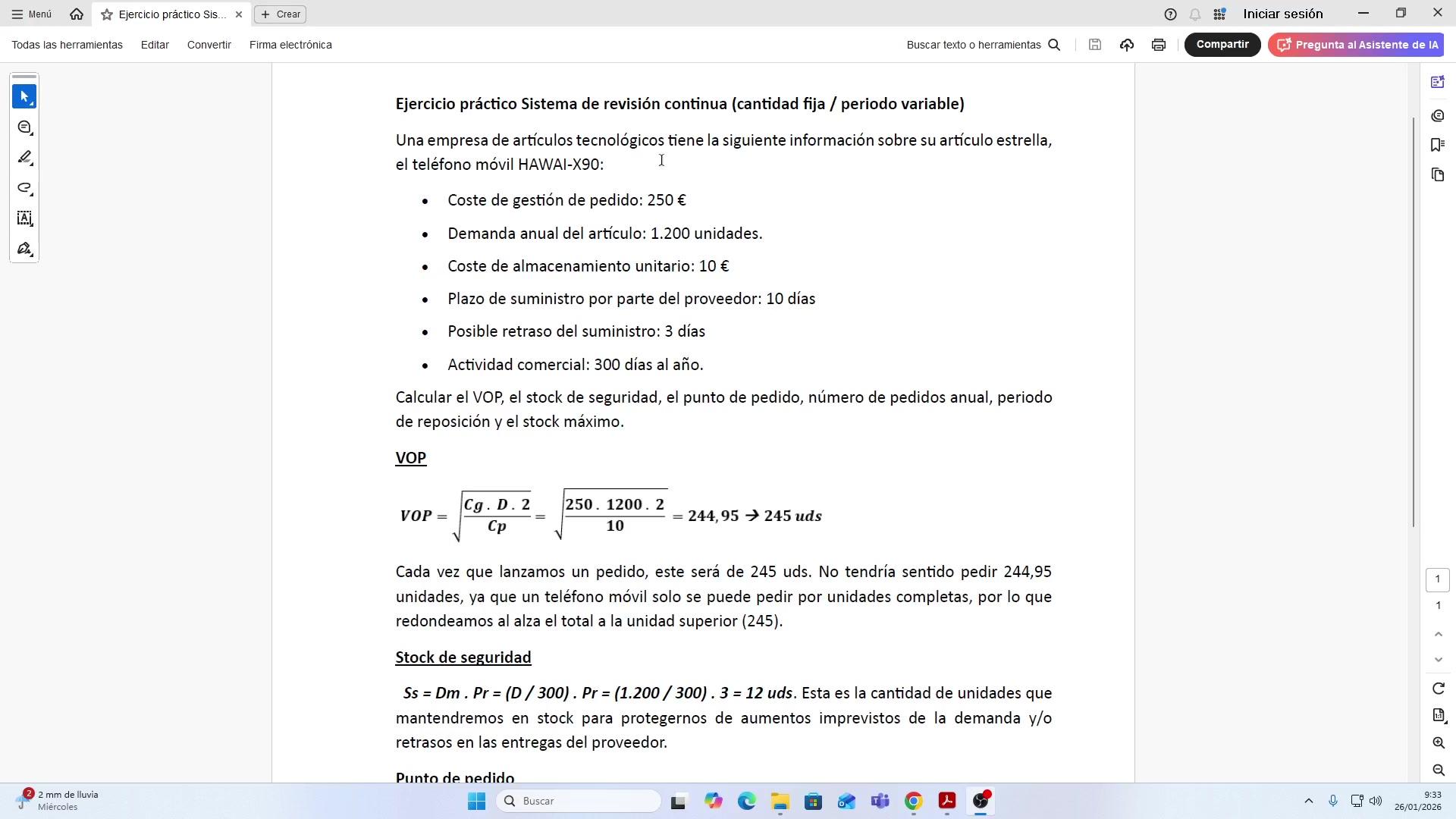 En primer lugar nos dice que tiene un coste de gestión de pedido de 250 unidades.