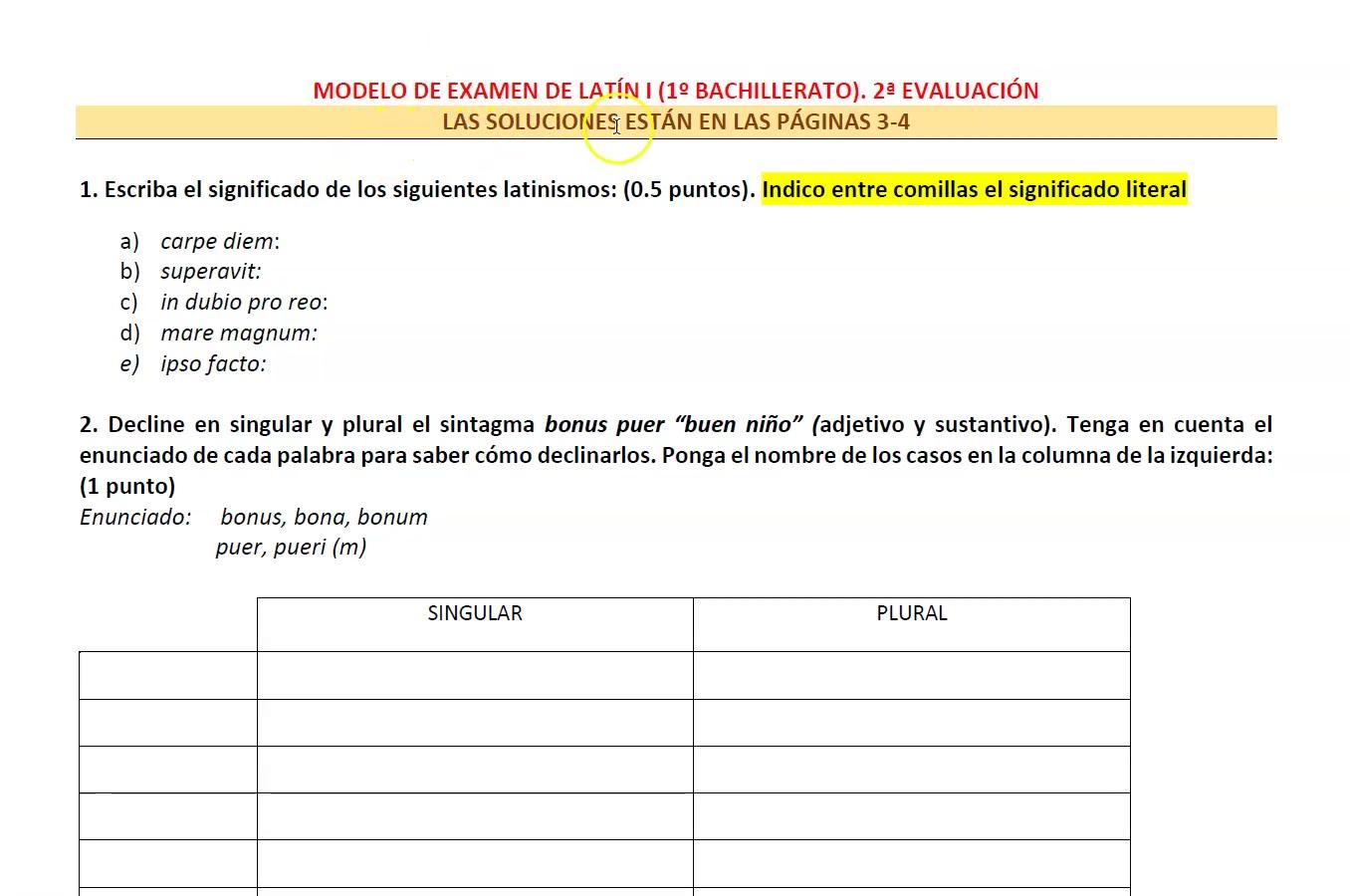 Modelo de examen de latín 1 de 1º de bachillerato de la 2ª evaluación.