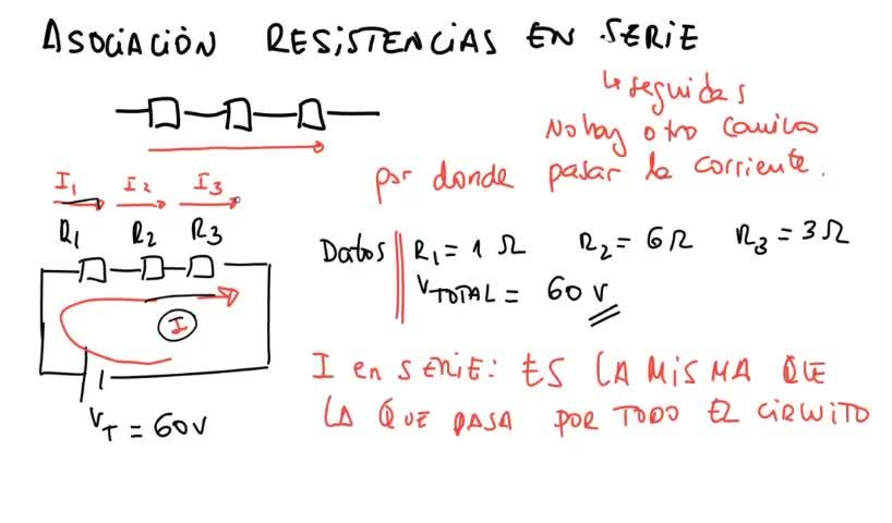 Que cuando tú tienes un circuito con un potencial y circula corriente, la I que tú vas a tener en el circuito va a ser la misma, esta I va a ser la misma que la que pasa por cada una de las resistencias.