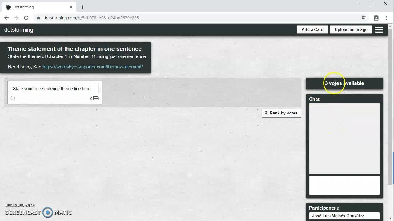 And now, the cool thing about this is that, of course, you can chat, you know, if it happens, if it so happens that some classmates are on while you are over there, you can chat over there, but more interesting than that is that you have these votes available, so you can come over here and vote for it, okay, so you could still have two votes available, read yours, I mean, write yours and then read your classmates and choose the one that you find.