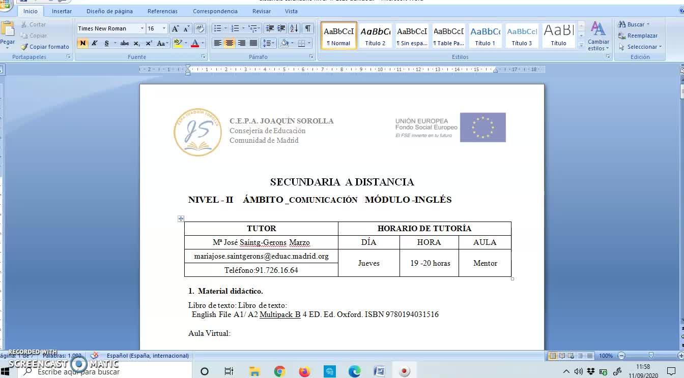 La hora de tutoría, como veis, la tenemos los jueves de 7 a 8.