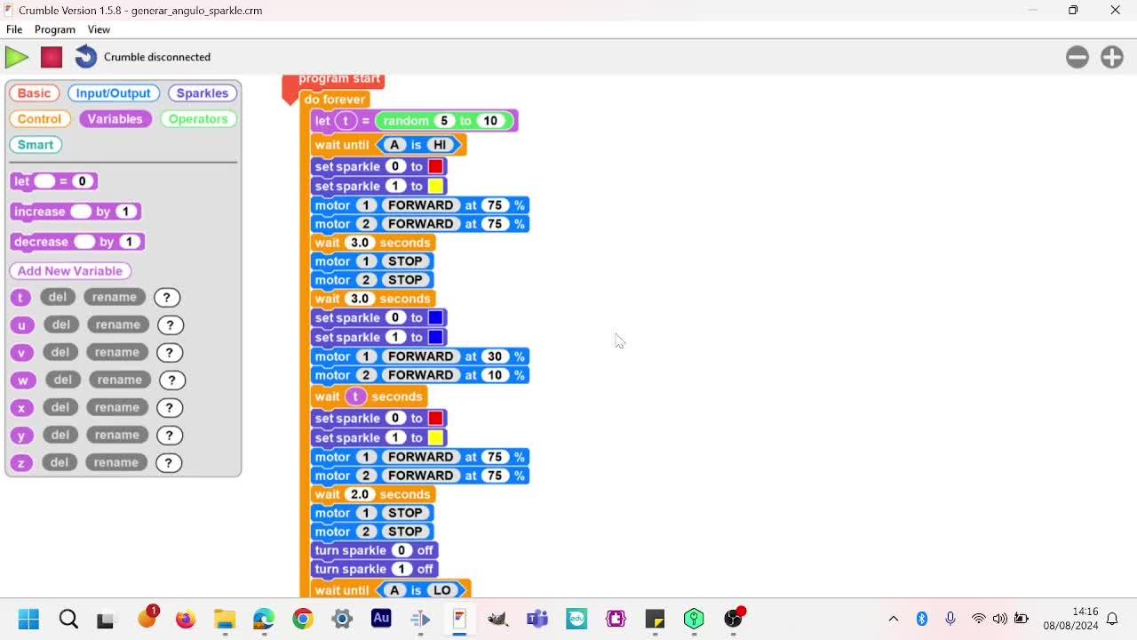 Utiliza Crumble programando tu robot MiiBot para generar ángulos al azar. Modifica potencia y tiempo. Todas las edades y capacidades. Programa en tu aula.
