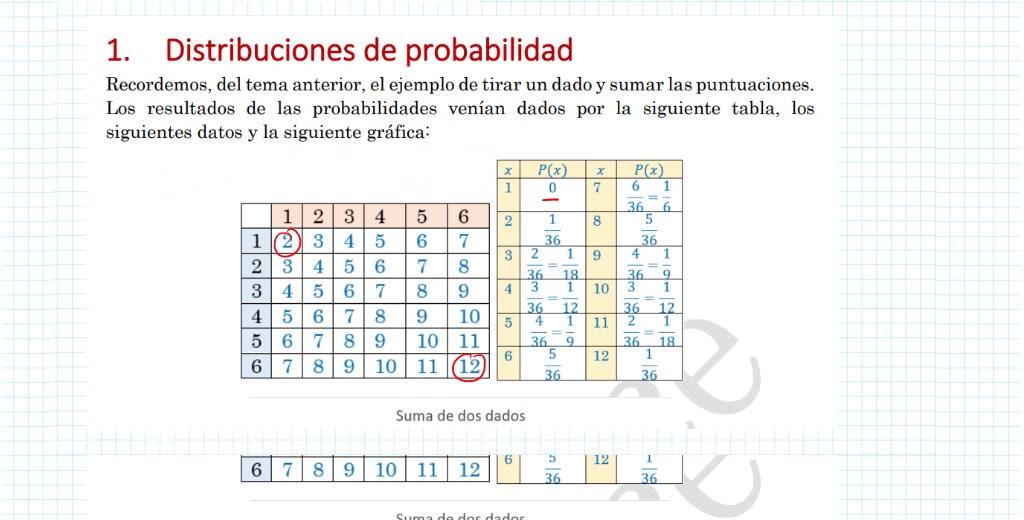 Entonces, ¿qué es lo que yo quiero que veáis un poco? Pues que, evidentemente, una distribución de probabilidad es una función que asocia a cada valor de la variable aleatoria estudiada la probabilidad de cada una de ellas. Es decir, si yo soy capaz de representar esto como una función, ¿cuál es la probabilidad de sacar un 1? Un 0. ¿Cuál es la probabilidad de sacar un 2? Uno partido de 36, ¿de acuerdo?