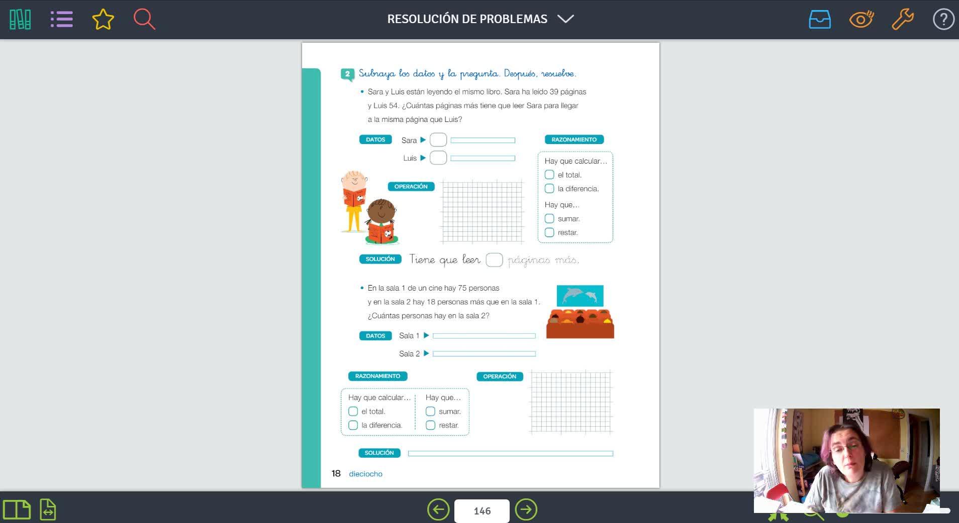 Y ahora cogeríamos el color rojo y diríamos, ¿cuántas páginas más tiene que leer Sara para llegar a la misma página que Luis?