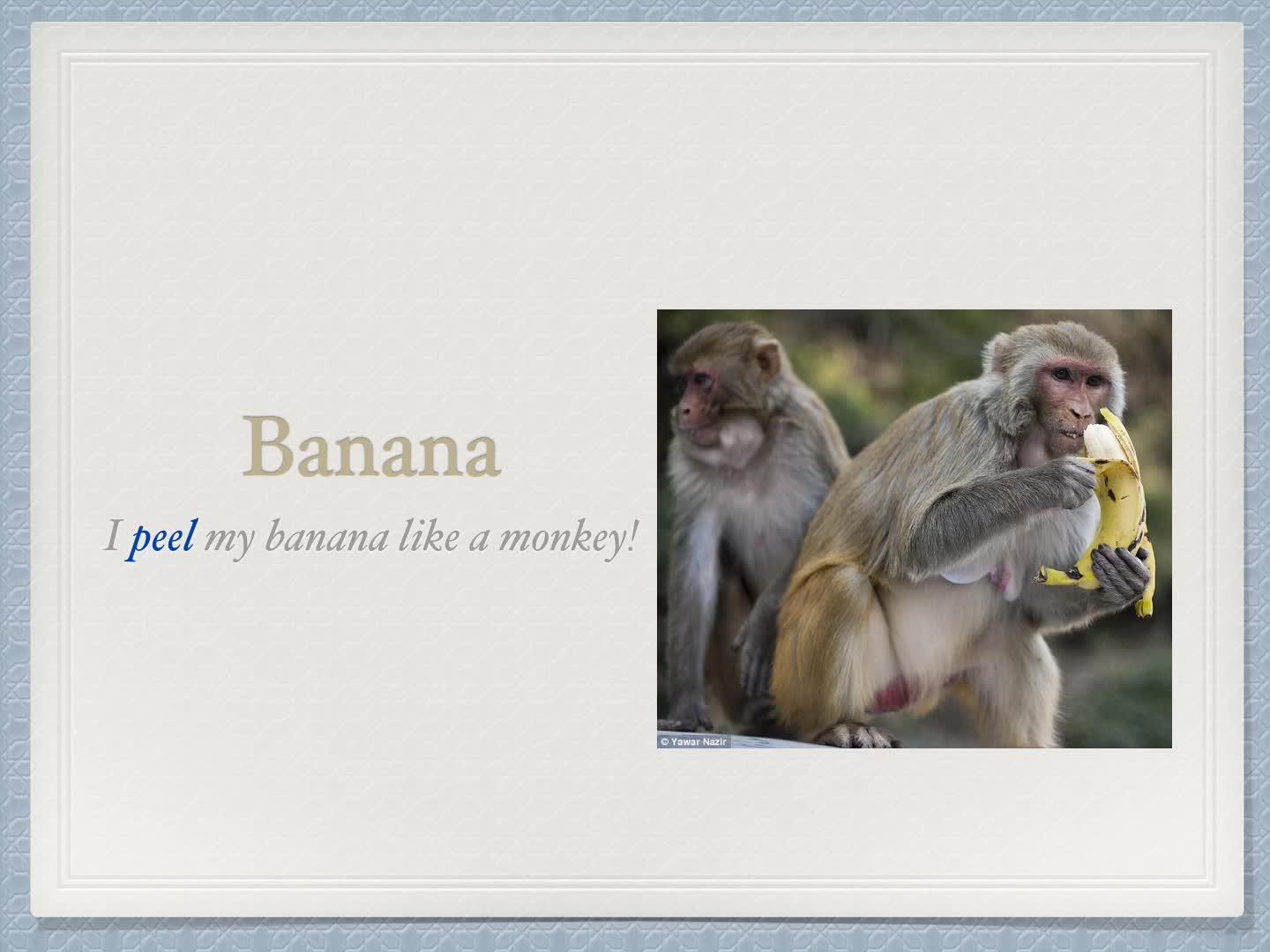 Banana, banana, banana. I peel my banana like a monkey.