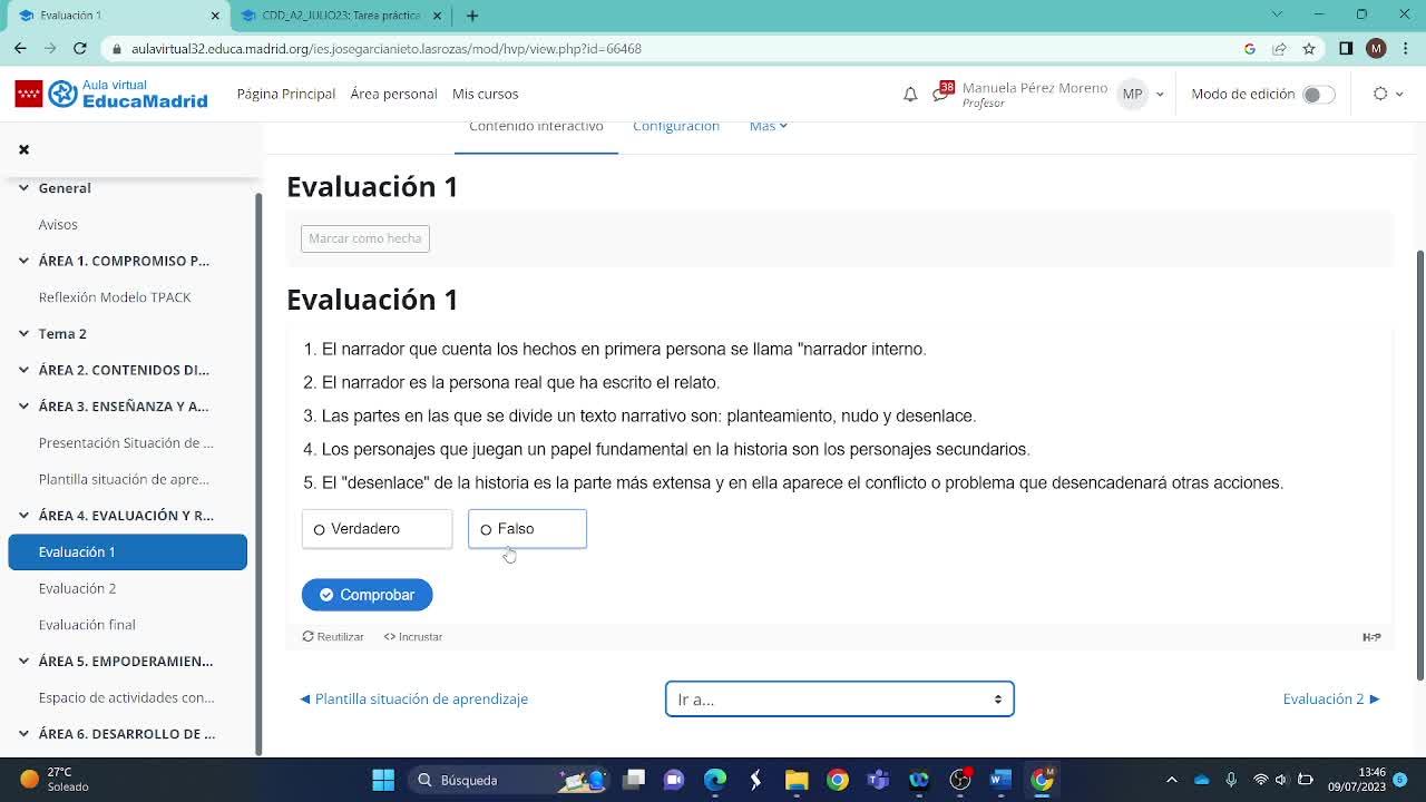 Por ejemplo, en el primer caso, en la primera actividad H5P, lo que he elegido es una actividad que consiste en cinco cuestiones, cinco preguntas relacionadas con el texto narrativo de respuesta verdadero-falso.