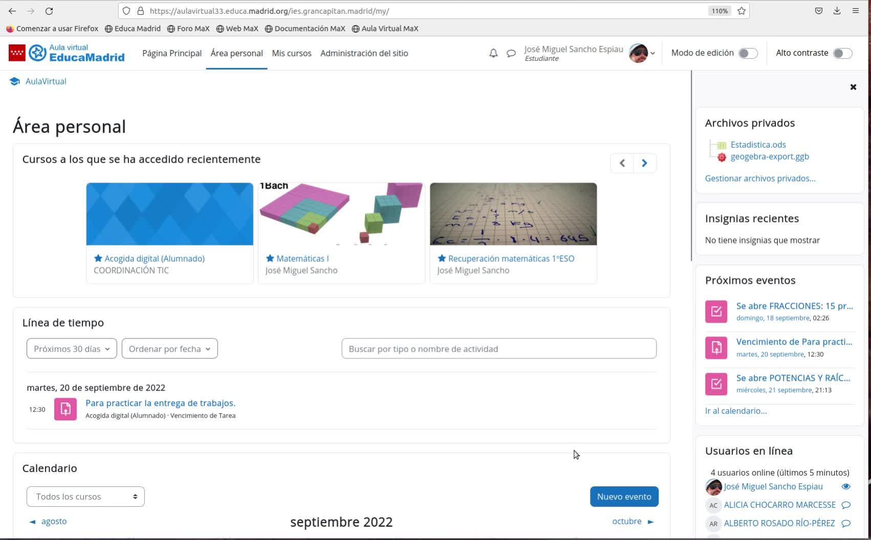 También puedo encontrar un calendario en el que se muestran todos los eventos que tengo apuntados en cualquiera de los cursos en los que estoy matriculado.