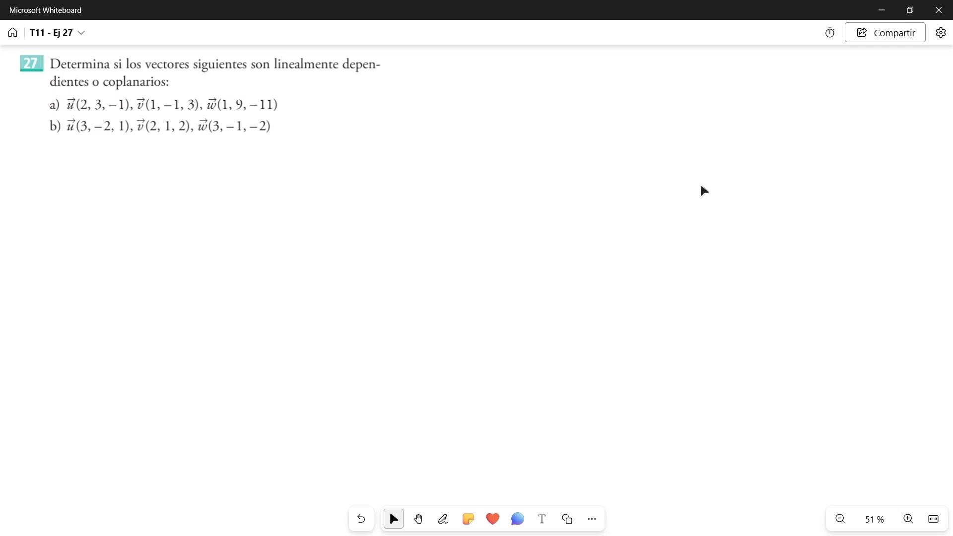 Vamos con el ejercicio 27, que me piden, me dan tres vectores y me dicen que miremos si son linealmente dependientes o coplanarios, ¿vale? Es lo mismo.