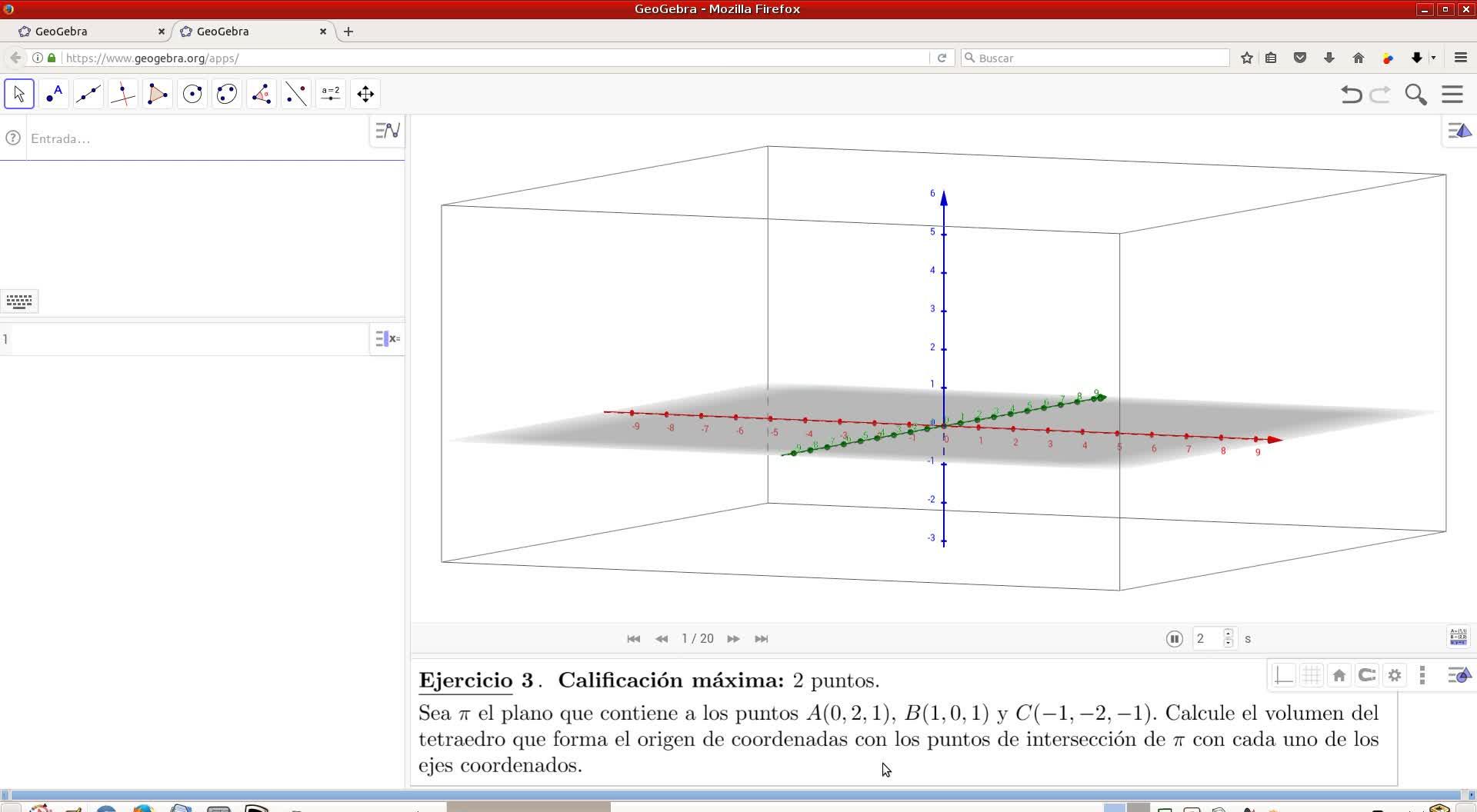 de GeoGebra, plano que pasa por 3 puntos, pues rápidamente nos pintaría el plano de
