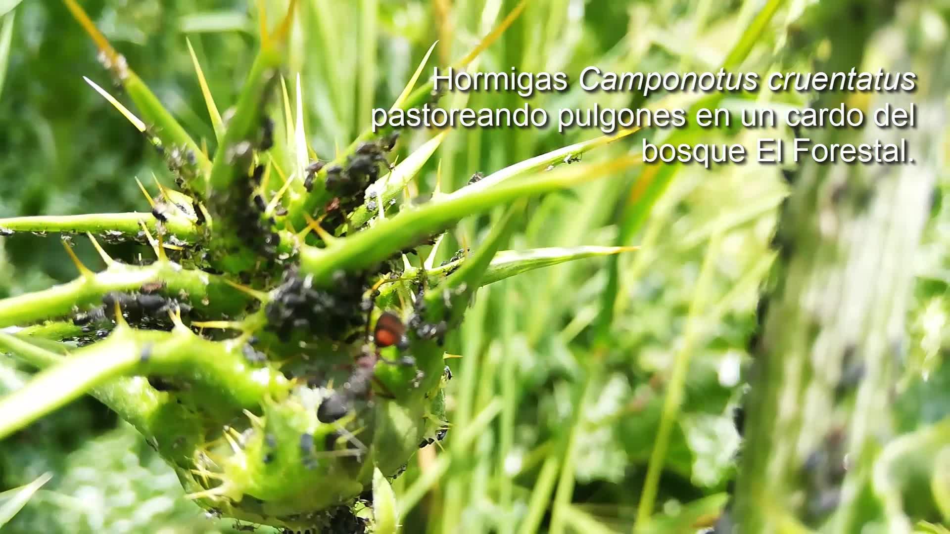 Hormigas pastoreando pulgones en un cardo del bosque El Forestal - Contenido educativo