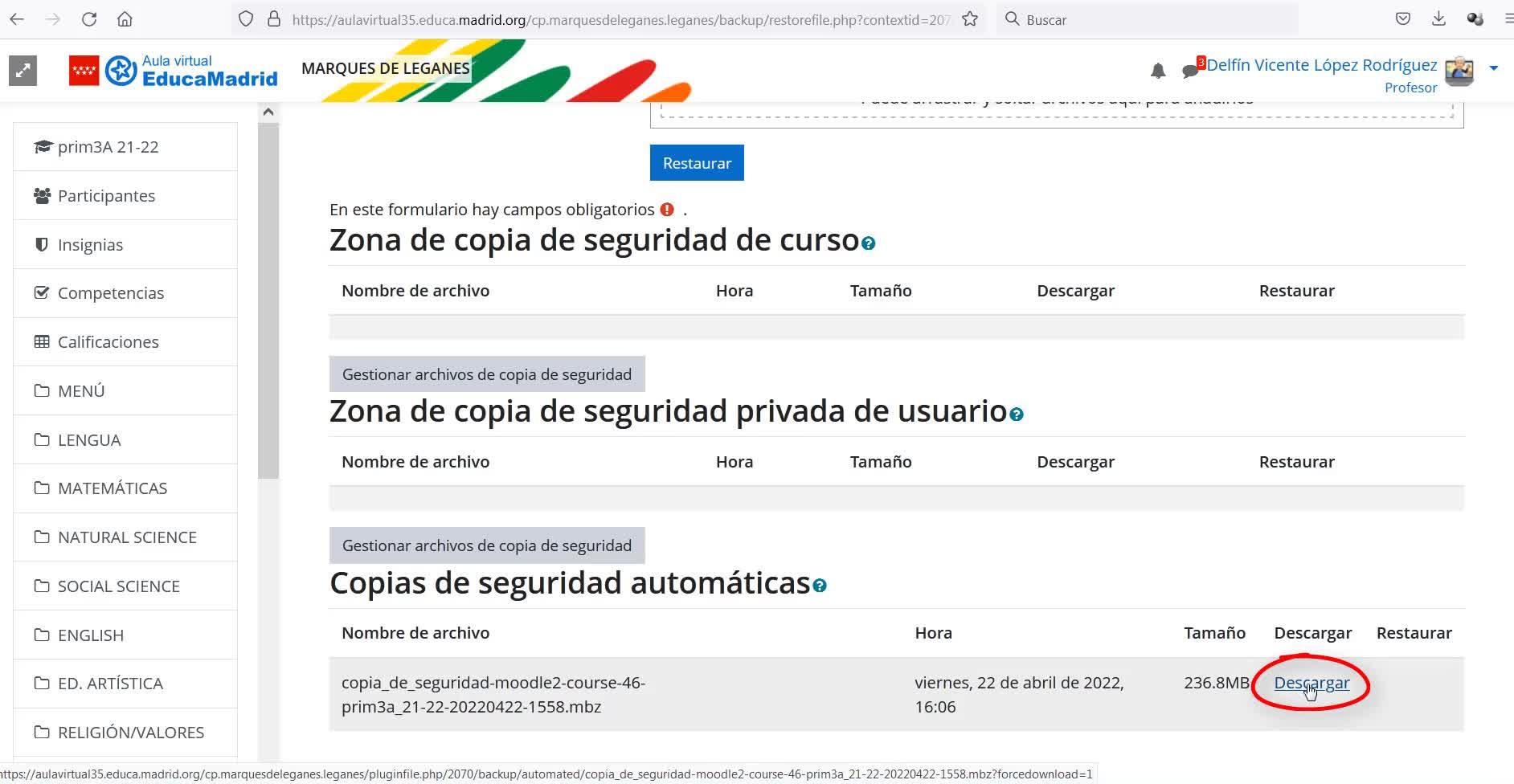 de la copia de seguridad que nos hemos descargado antes