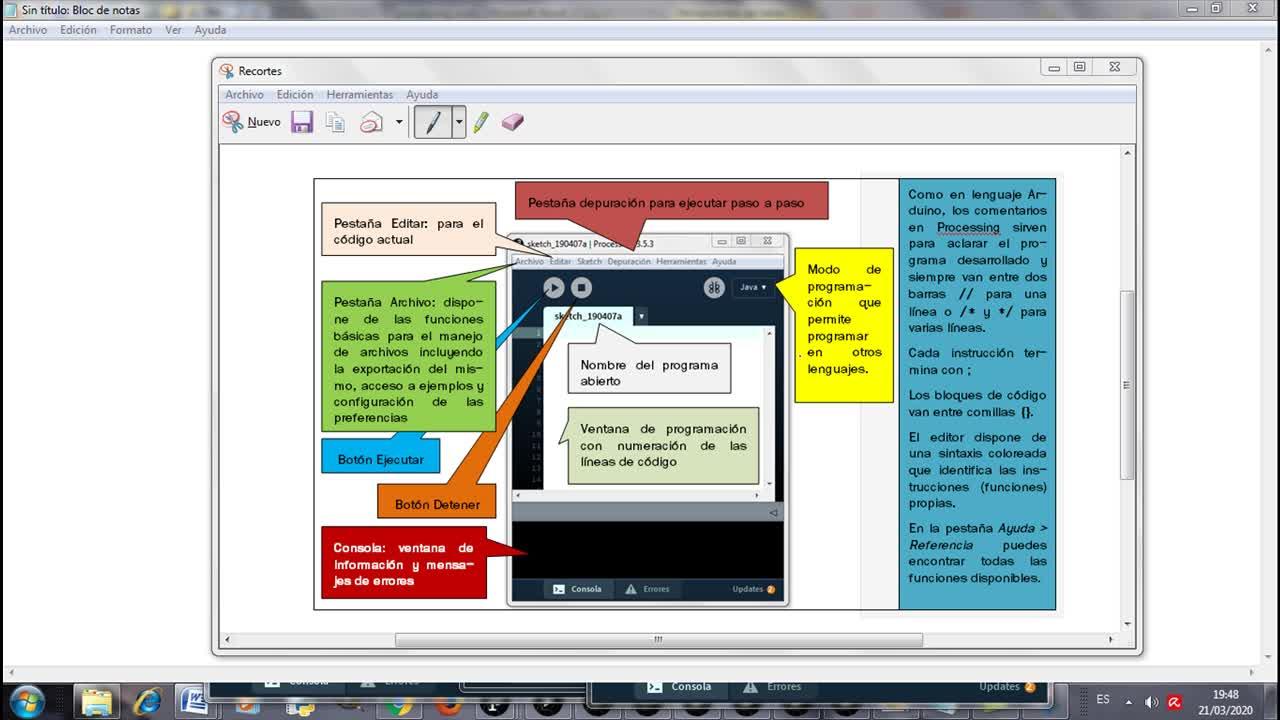 Como cosas importantes a destacar en el processing es que, como ya sabéis, las instrucciones que vamos a programar en esta ventana deberían ir acompañadas de unos comentarios,