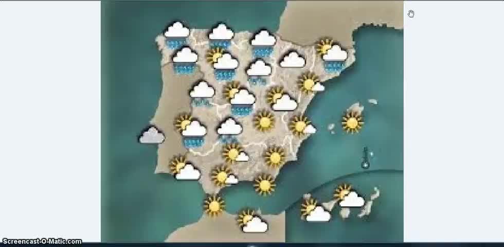 Hi, I am Jose and today I am the weather reporter. Let's start with the north of Spain. It's cloudy and raining. There's so go to the cinema with your umbrella. Don't forget it.