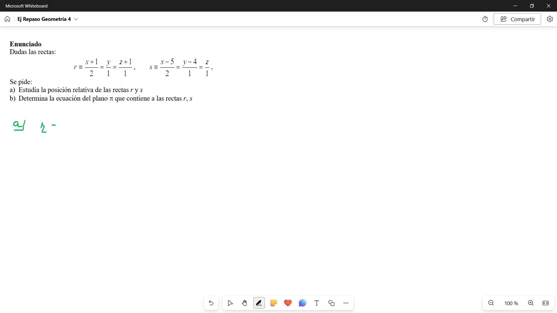 Hola, vamos a ver este ejercicio. Me dan dos rectas en forma continua y lo primero que me piden es calcular la posición relativa de las dos rectas, de R y de S.