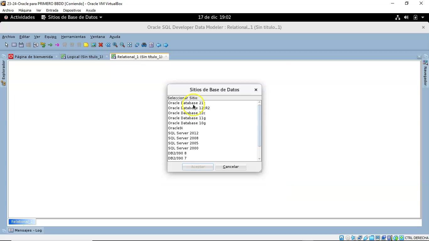 le doy a aceptar, digo que para qué base de datos está esto, para qué es la 21C, la versión 21C