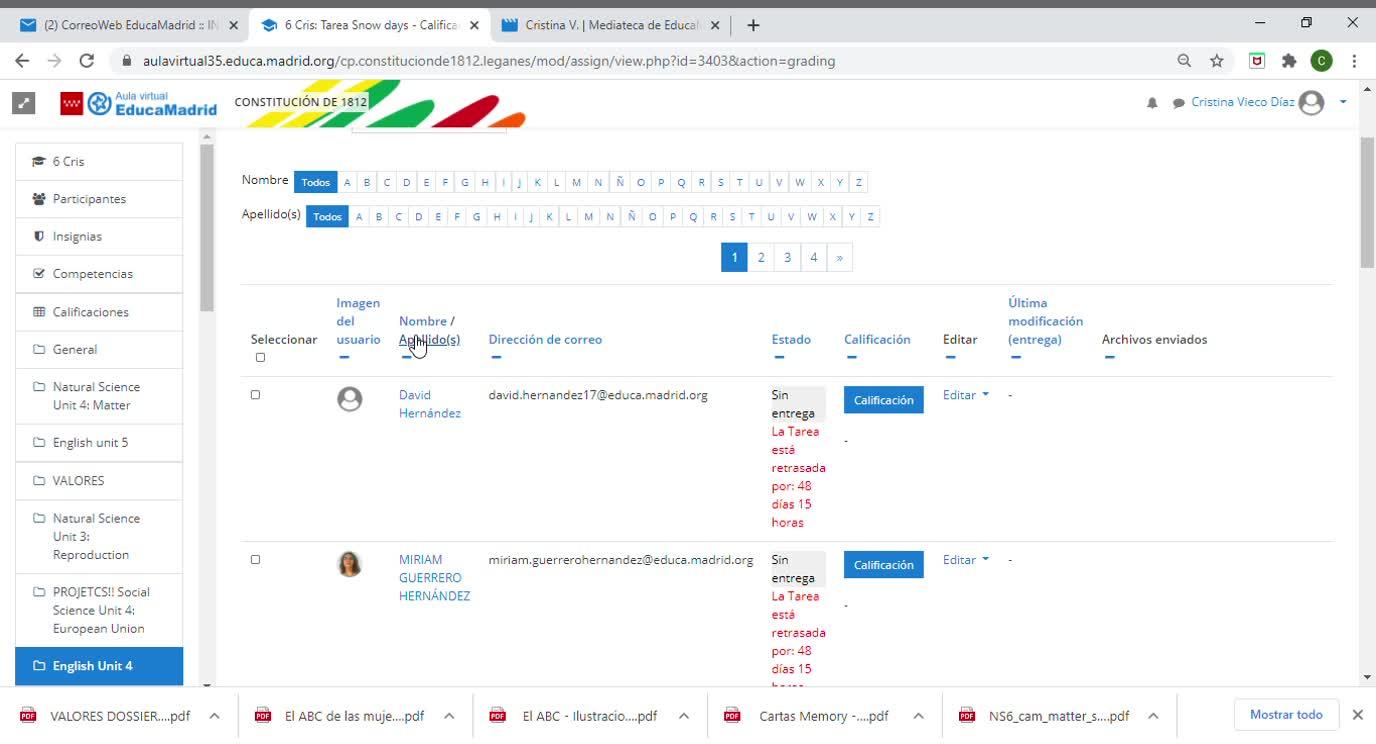 Aquí os saldrán todos los niños que tengáis y en los que os hayan entregado la tarea, por ejemplo aquí, te pone enviado para calificar.