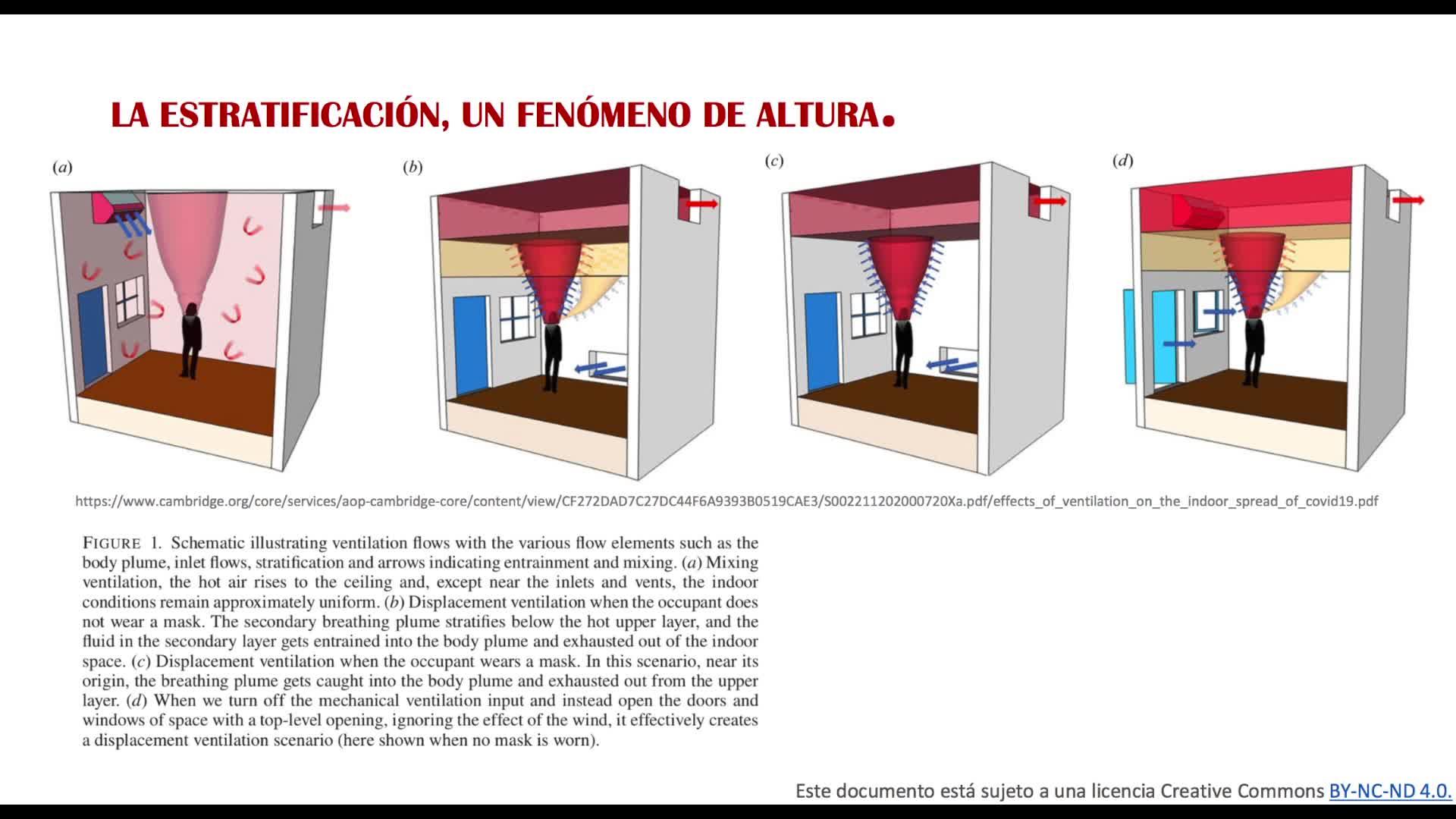 Es un modelo y por eso está simplificado. Y entonces todas esas emanaciones, digamos, de calor hacen que ese aire suba y se acumule arriba. Con lo cual, aquí lo que están es sugiriendo la forma de ventilar ayudado de diversas estrategias de aire, ya sean mecánicas, como veis en el A, y de abertura natural, como veis en el D, y cuáles son los efectos.