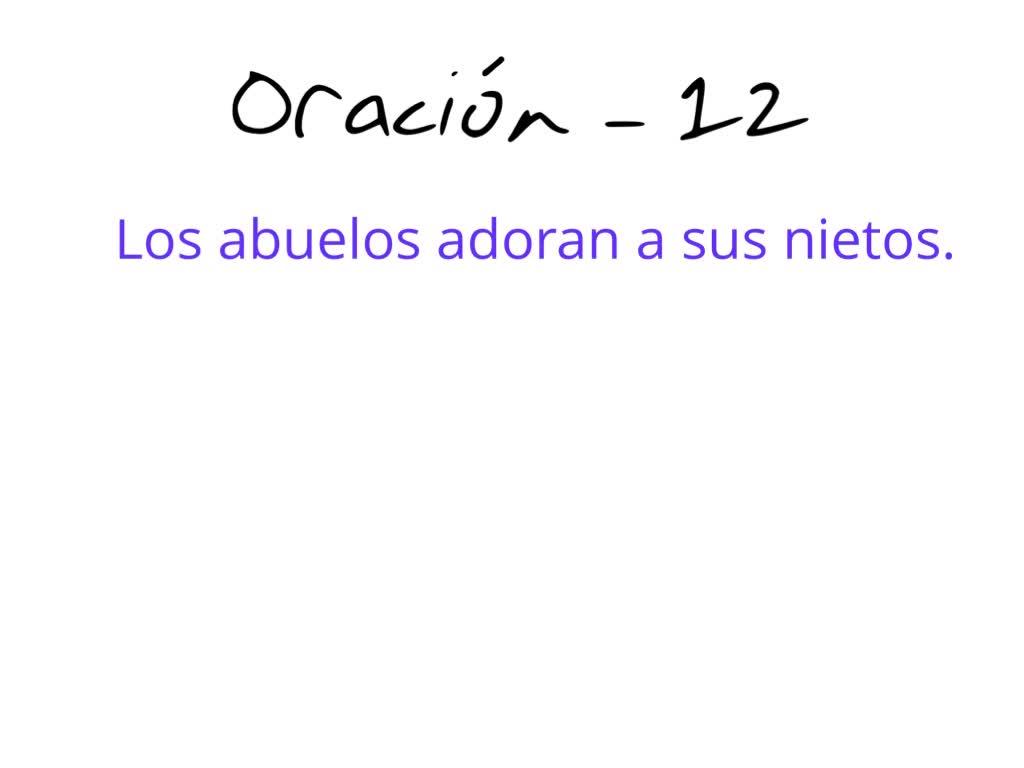 Oración número 12. Los abuelos adoran a sus nietos. Verbo adorar. Vale. Adora. Los abuelos adora a sus nietos. Uy, sería el abuelo adora a su nieto, a sus nietos. Por lo tanto, los abuelos, sujeto y todo lo demás, predicado.