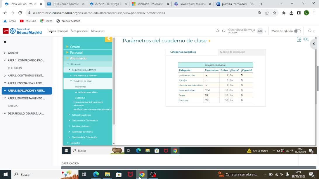 Número 4 es el cuaderno del profesor y entonces hemos hecho unos parámetros del cuaderno en el cual hemos puesto pruebas escritas,