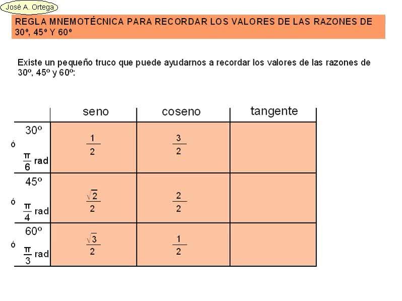 En este caso se trata de ayudarnos a recordar los valores de las razones de 30, 45 y 60