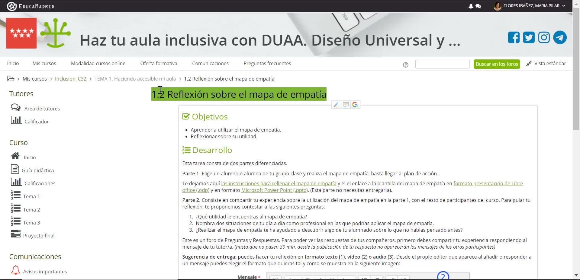 En este caso vamos a coger como ejemplo la tarea 1-2, reflexión sobre el mapa de la empatía.